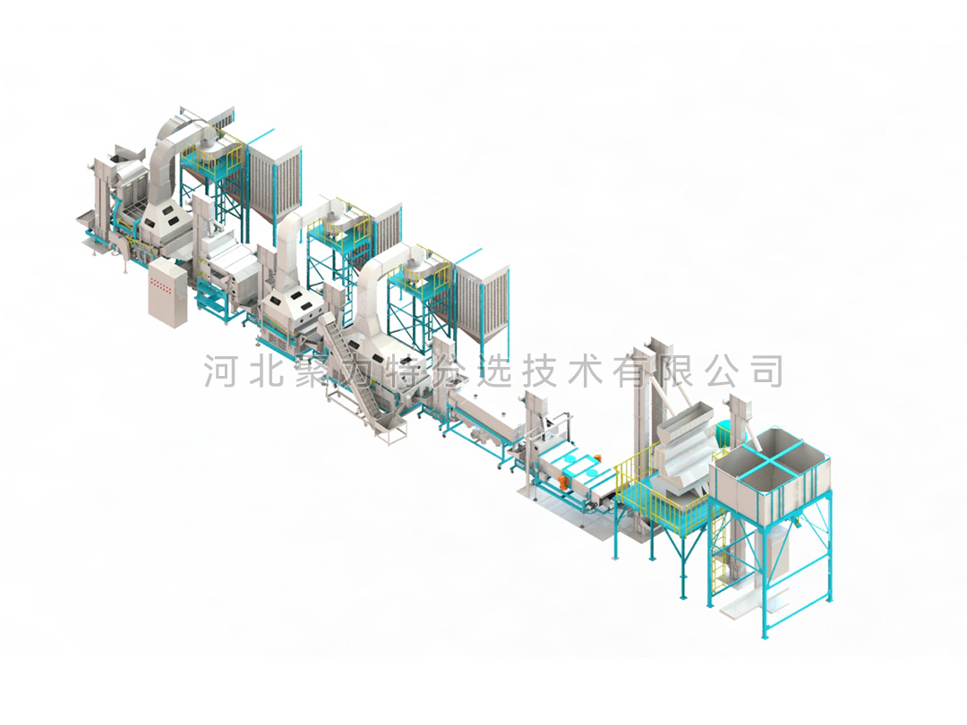 豆類清理生產(chǎn)線由風篩清選機、磁力選土機、比重去石機、比重精選機、拋光機、振動分級篩、定量包裝秤、脈沖除塵器、布袋除塵器、提升機和其他輔件組成。